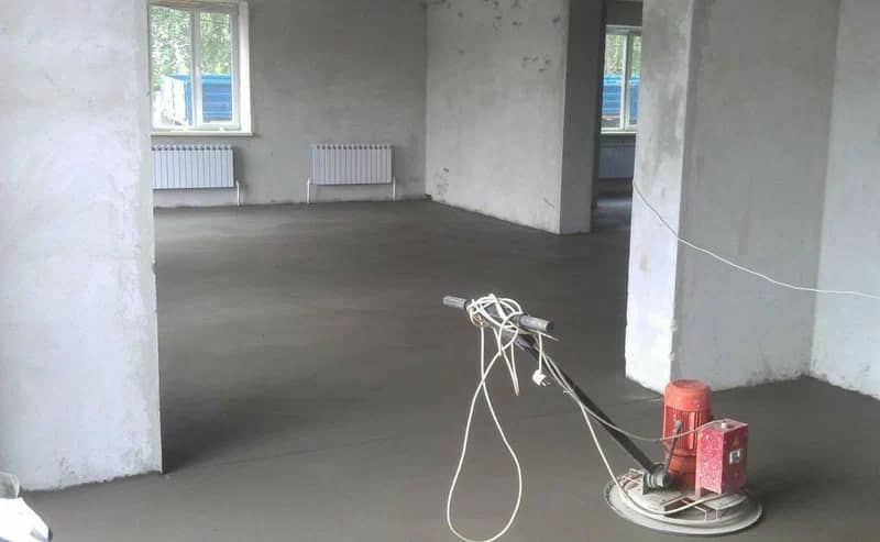 Для шлифовки полусухой стяжки используются специальные шлифовальные машины, оснащенные металлическими дисками. Работы по шлифовке поверхности начинаются сразу после разравнивания раствора и заканчиваются до начала схватывания раствора в течение 1,5 — 2 часов с момента подачи. Как результат: поверхность стяжки становится ровной и прочной.