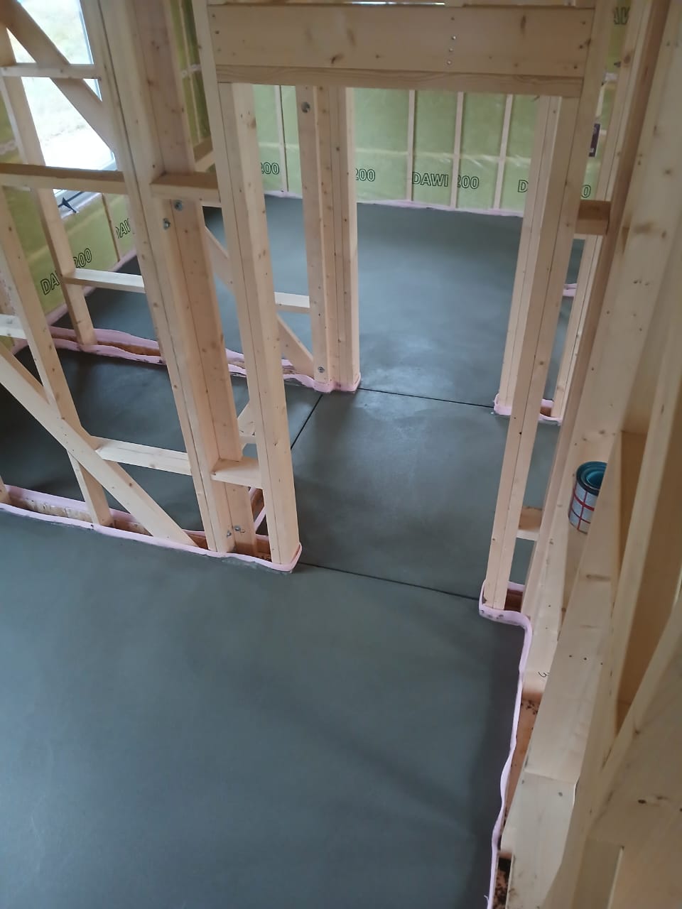 Укладка полиэтиленовой пленки толщиной 50-100 микрон, что обеспечит сохранение необходимого количества влаги в стяжке для гидратации цемента и равномерного высыхания. По периметру стен и других конструкций помещения укладывается демпферная лента толщиной 5-10 мм., для компенсации теплового расширения стяжки.